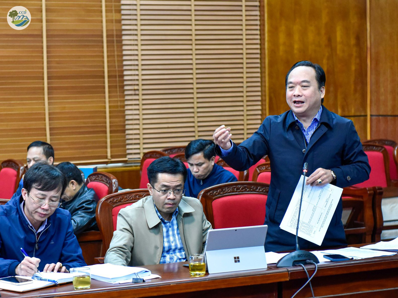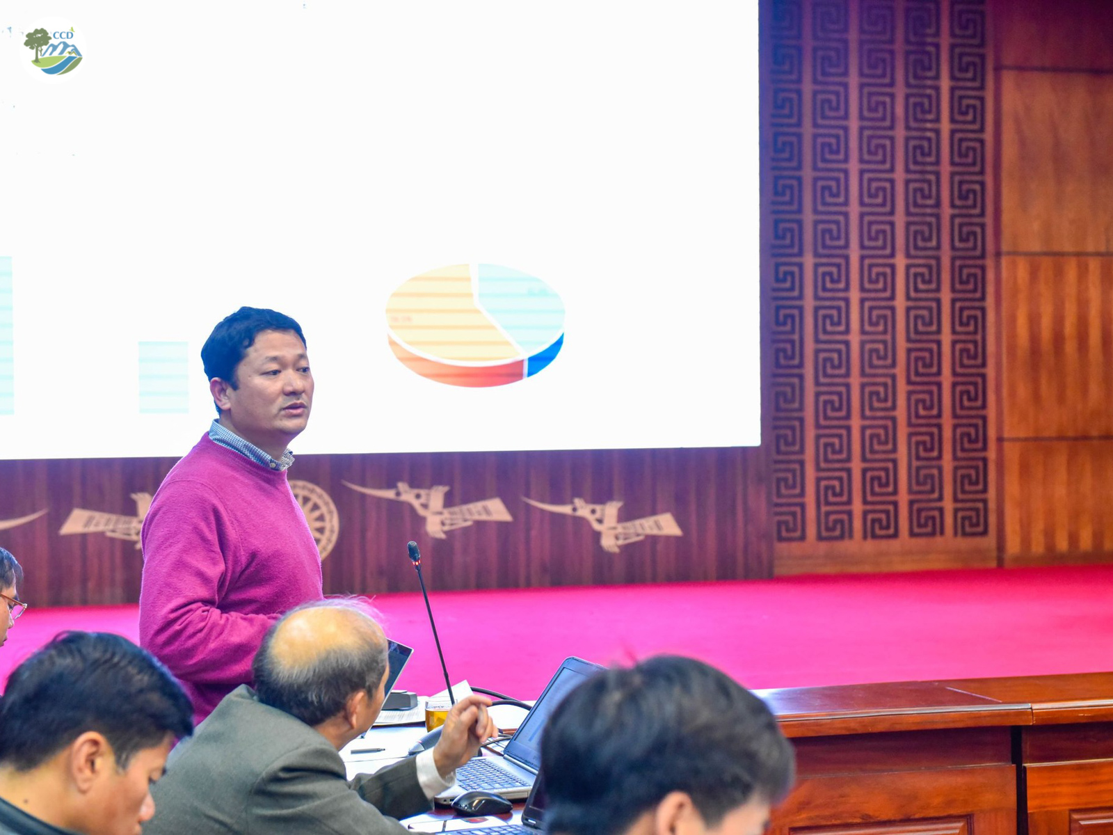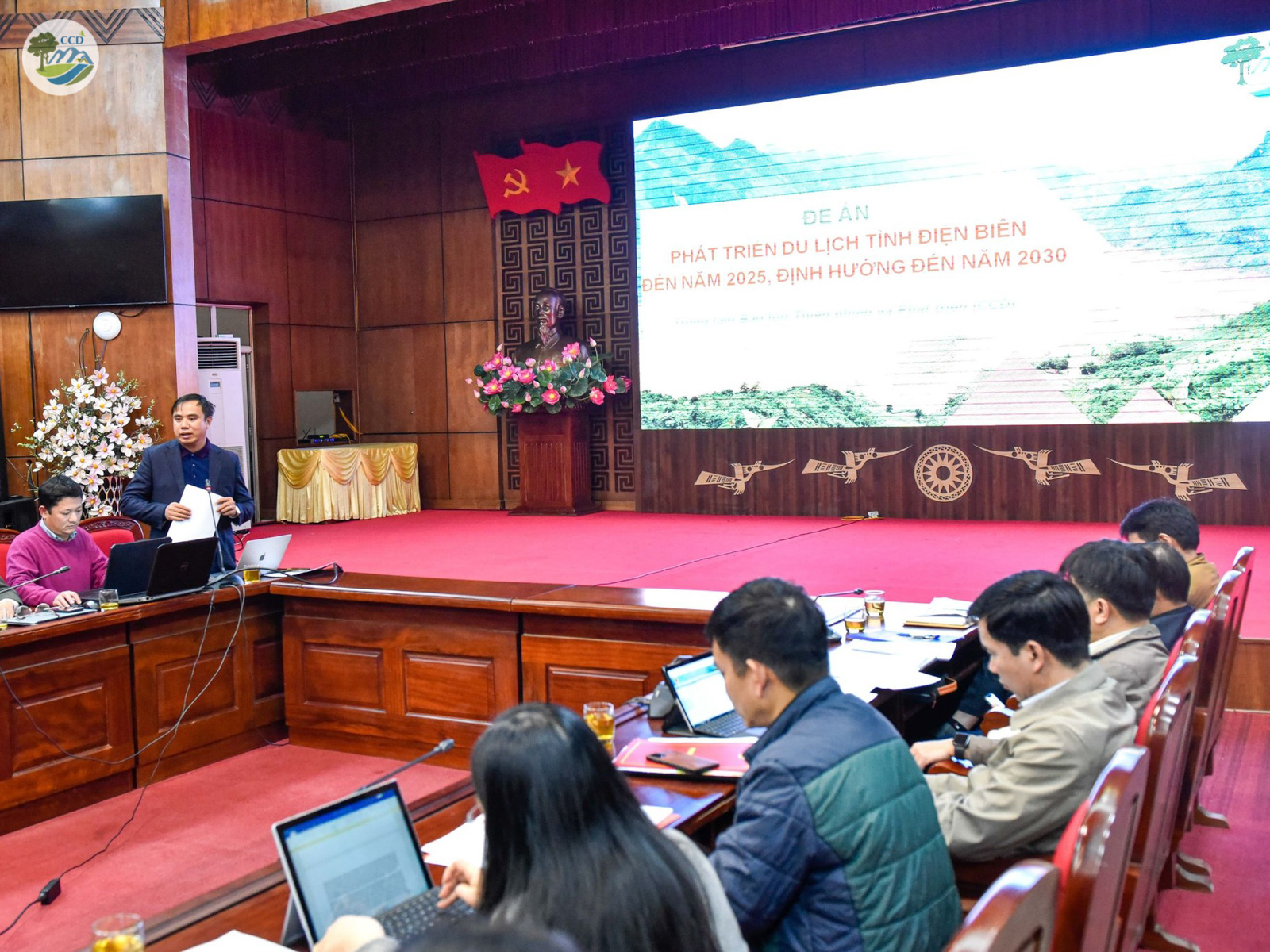 (From left to right)Picture 1: Mr. Le Thanh Do, Chairman of Dien Bien People's Committee is coordinating the meetingPicture 2: Dr. Nguyen Manh Ha - Director of CCD is presenting the PlanPicture 3: Mr. Nguyen Minh Phu, Head of Department of Culture, Sports and Tourism, Dien Bien province shared the implementation process and the overview of the Plan