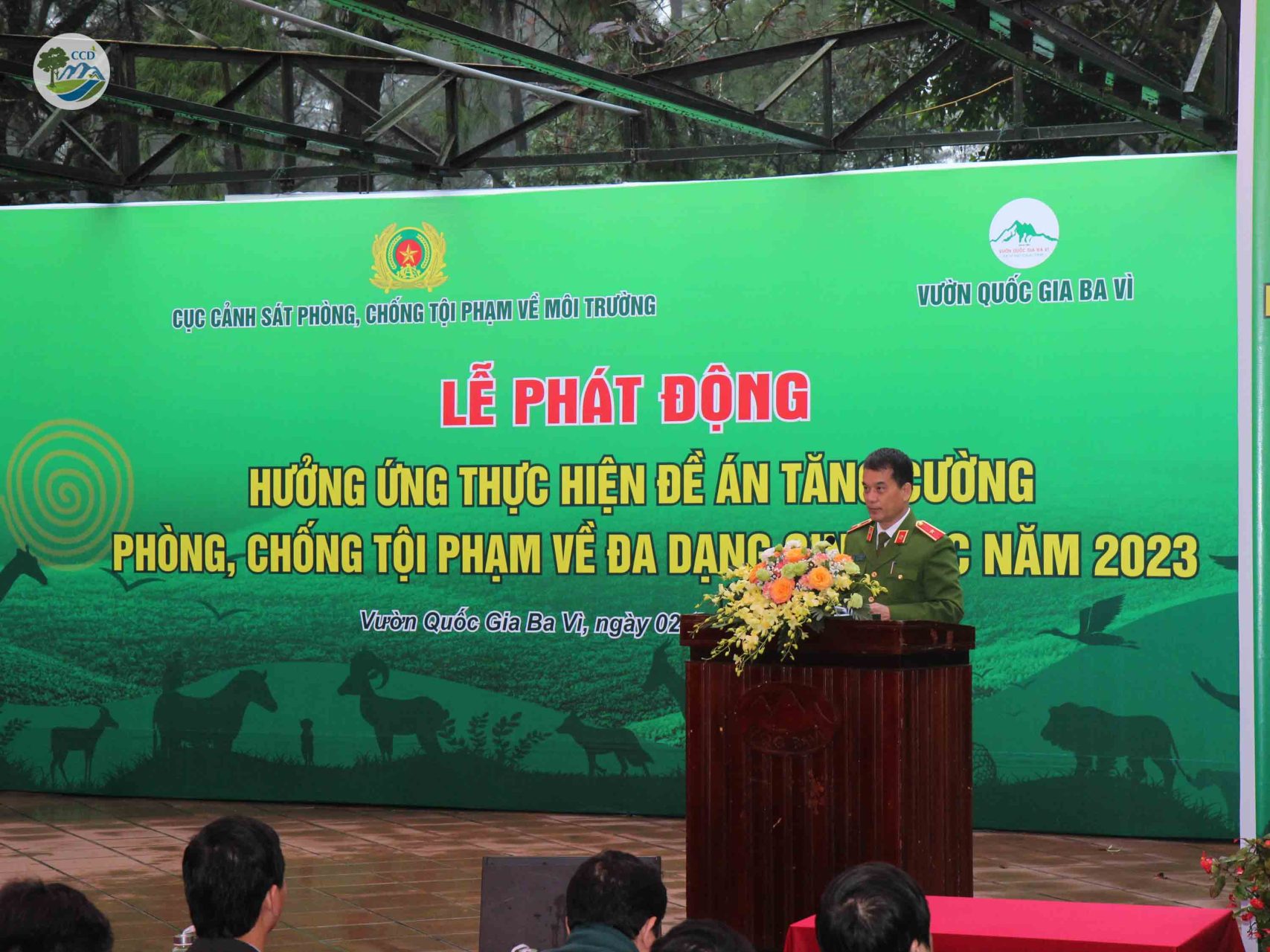 Picture 1: Major General Ha Xuan Duy – Deputy Director of C05 is giving the opening remarks in response to the implementation of the biodiversity protection plan (©CCD/2023)Picture 2: The launching ceremony gathered units in the police sector, non-profit organizations in biodiversity conservation sector, secondary and high schools in Tan Linh commune, Ba Vi district, local people and tourists (©CCD/2023)