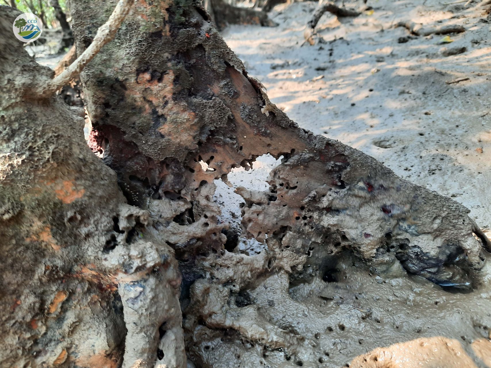 CCD’s team conducted surveys and identified Sphaeroma terebrans – a crustacean species belonging to the Sphaeromatidae family, Isopoda order, Malacostraca class as one of the main agents of the mass death of mangroves. The crustacean colonizes the internal, thereby hollowing out and breaking trunks.