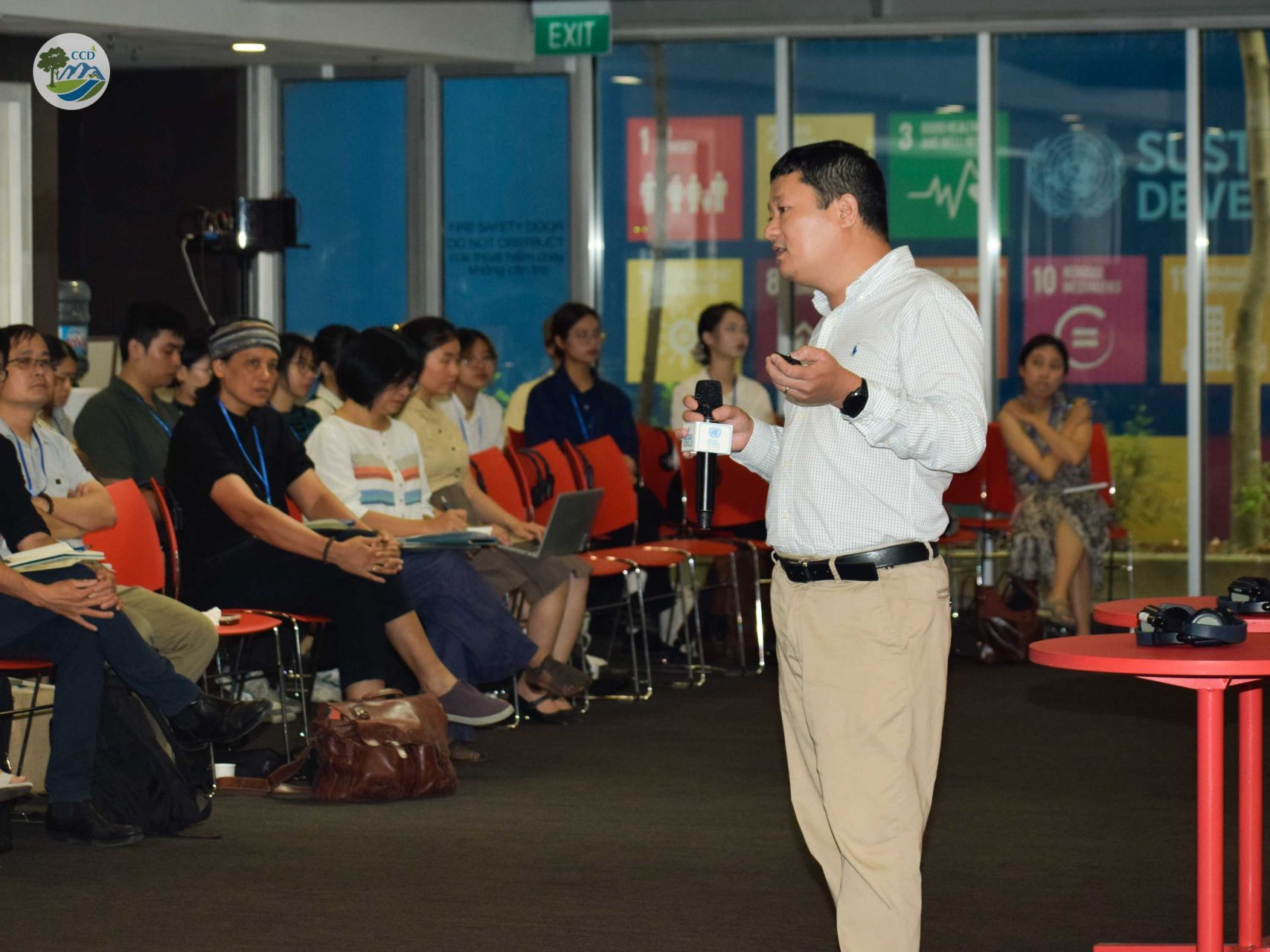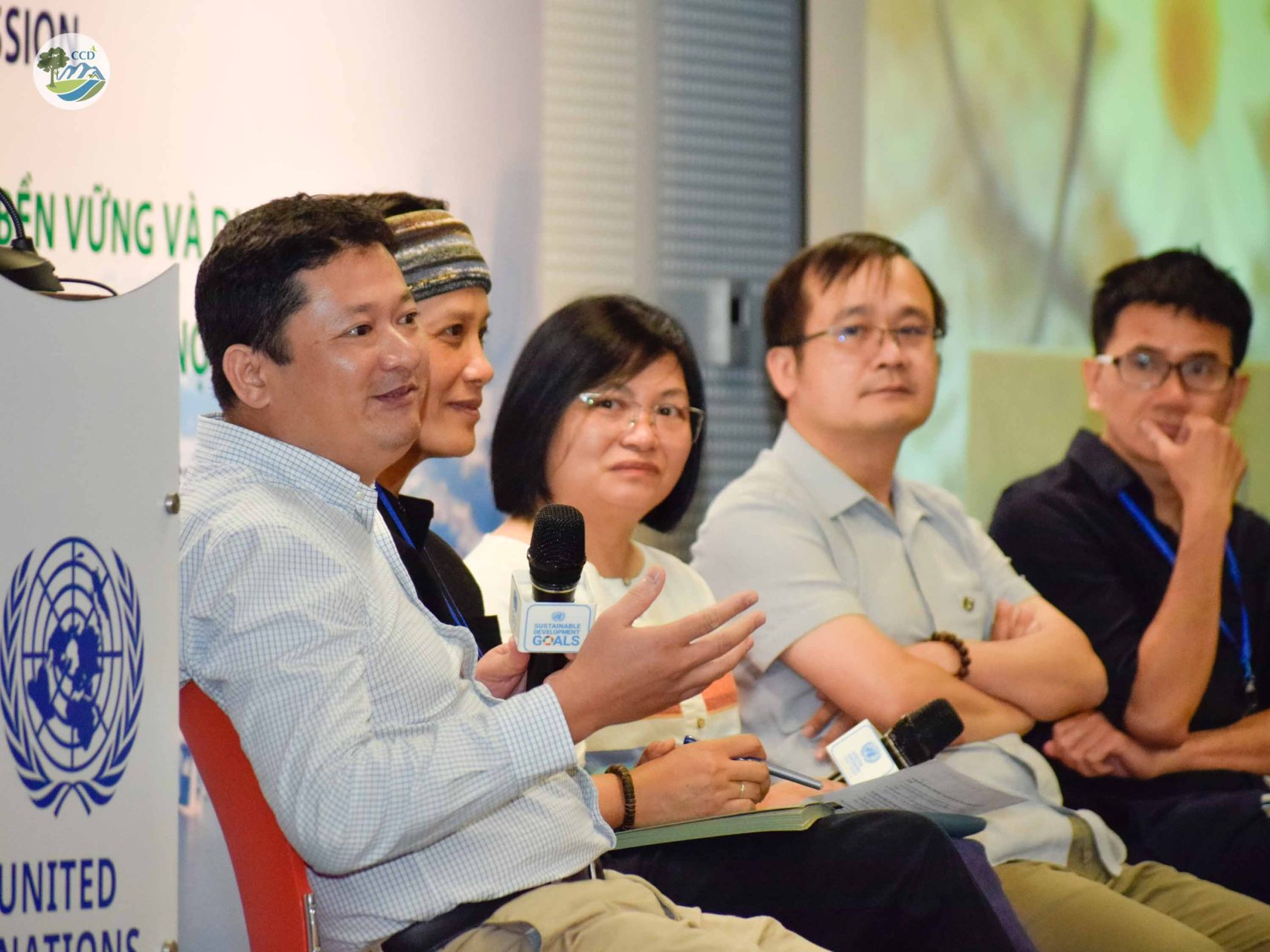 From left to right:Picture 2: Dr. Nguyen Manh Ha – Director of CCD shares the ecological status of alluvial plains and islets of the Red river in Hanoi cityPicture 3: Speakers discuss aspects of sustainable and inclusive development in Hanoi city with attendees©CCD/2024
